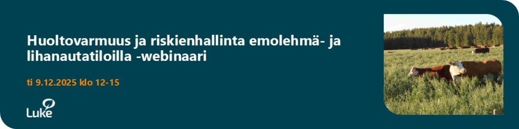 Mitä riskejä emolehmä- ja lihanautatilat kohtaavat ja miten tilat voivat parantaa varautumista erilaisiin riskeihin? Mitkä ovat maatalouden huoltovarmuuden olennaisimmat kysymykset? Miten säilytämme maa- ja elintarviketalouden huoltovarmuuden Suomessa ja miten voisimme vähentää riippuvuutta tuontipanoksista? Webinaari on suunnattu emolehmä- ja lihanautatiloille ja neuvojille.
